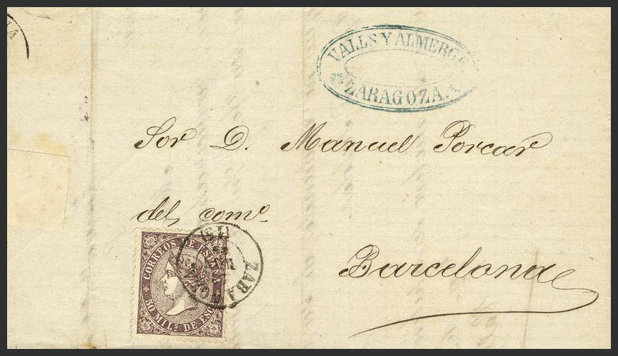 98. 1869. 50 mils violet. ZARAGOZA to BARCELONA. Postmark ZARAGOZA / (15). MAGNIFICENT.