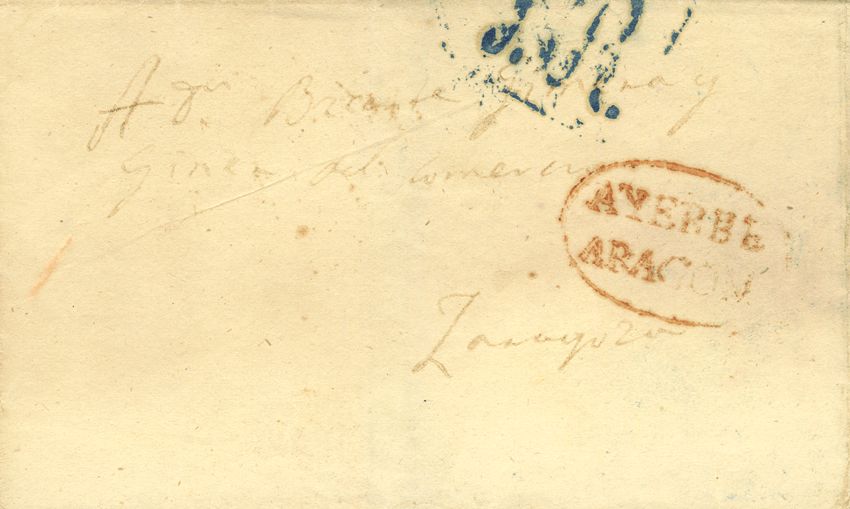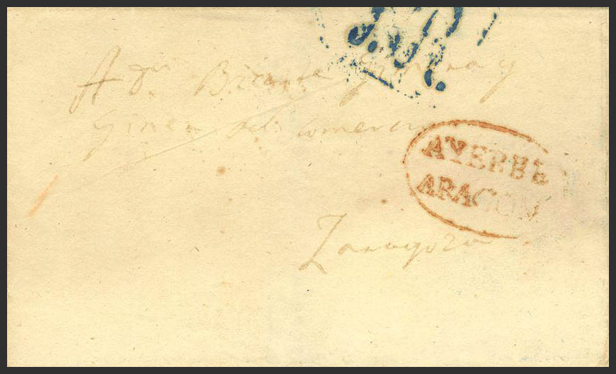 English 1847. AYERBE to ZARAGOZA. AYERBE / ARAGON brand, in red (PE 5). BEAUTIFUL AND RARE.