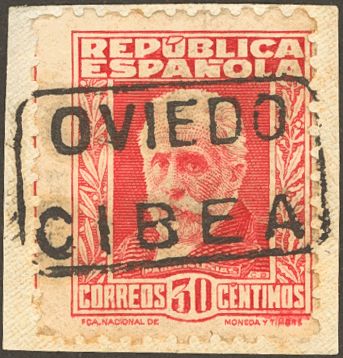 △ 669. 1932. 30 cts carmine, fragment. Mail postmark CIBEA / OVIEDO. MAGNIFICENT.