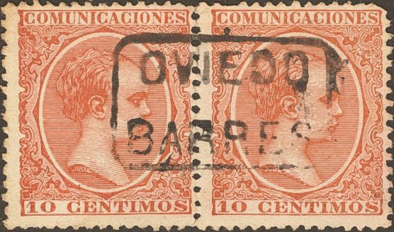 217. 1889. 10 cts chestnut, pair. Postmark postmark BARRES / OVIEDO. MAGNIFICENT.