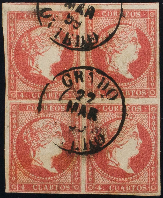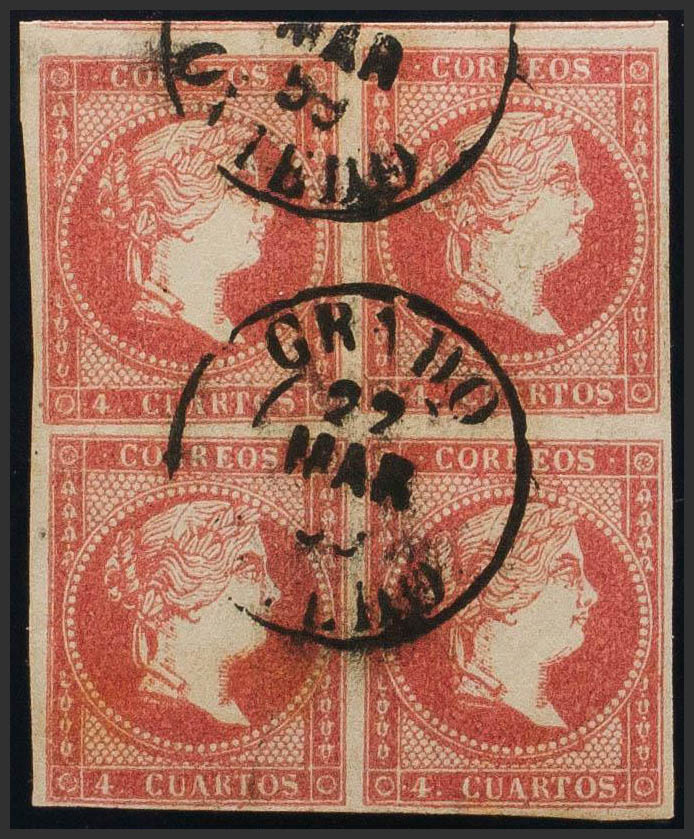 48(4). 1856. 4 red cuartos , block of four. Postmark GRADO / OVIEDO (Type I). MAGNIFICENT AND RARE.