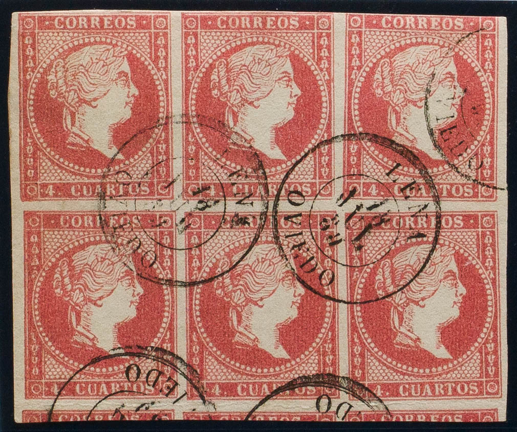 English 48(6). 1856. 4 red cuartos , block of six. Postmark LENA / OVIEDO. MAGNIFICENT AND RARE.