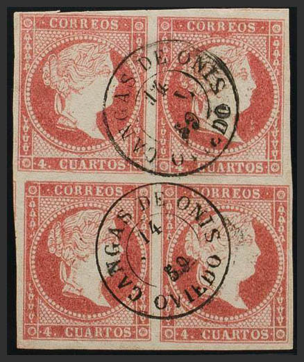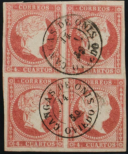 48(4). 1855. 4 red cuartos , block of four. Postmark CANGAS DE ONIS / OVIEDO. MAGNIFICENT.
