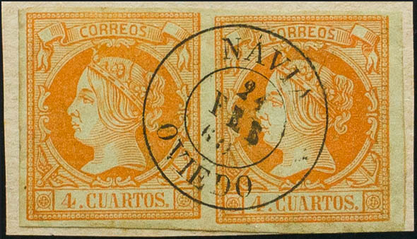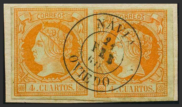 English 52(2). 1860. 4 cuartos orange, pair. Postmark NAVIA / OVIEDO. MAGNIFICENT.
