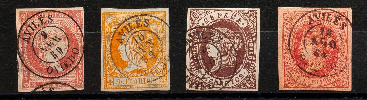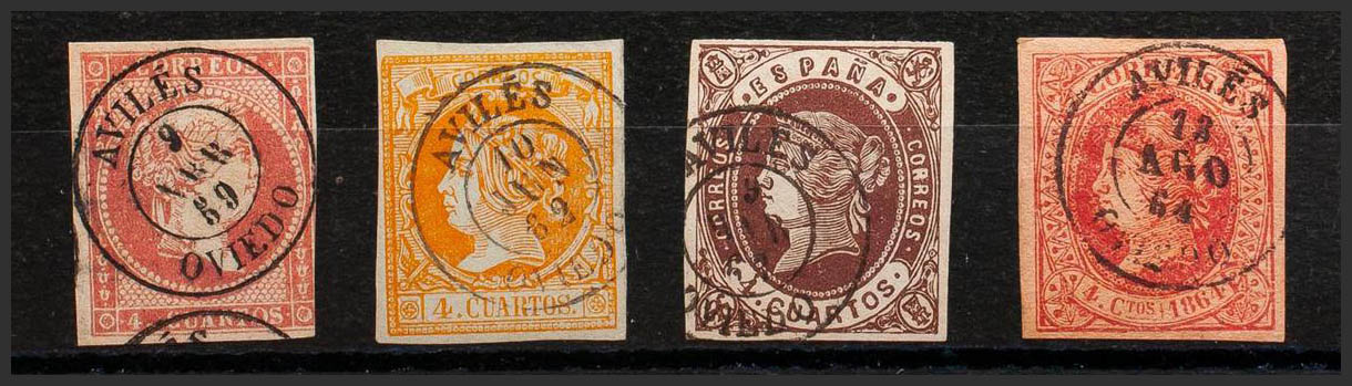English 48, 52, 58, 64. (1855ca). Set of four 4- cuartos stamps red, yellow, brown and pink, unused with AVILES / OVIEDO postmark. MAGNIFICENT.