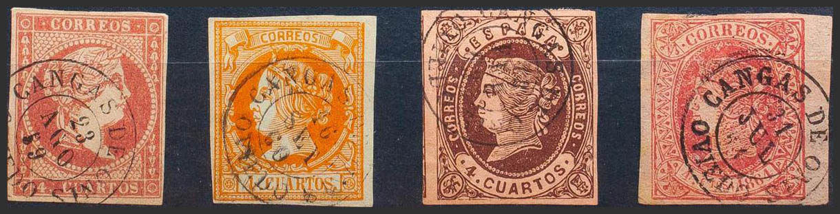 48, 52, 58, 64. (1855ca). Set of four 4- cuartos stamps red, yellow, brown and pink, unused with CANGAS DE ONIS / OVIEDO postmark. MAGNIFICENT.