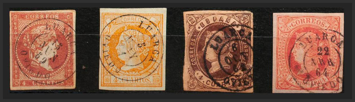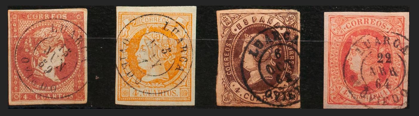 48, 52, 58, 64. (1855ca). Set of four 4- cuartos stamps red, yellow, brown and pink, unused with LUARCA / OVIEDO postmark. MAGNIFICENT.