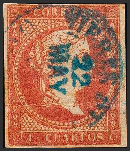 48. 1855. 4 cuartos red. Postmark MIERES DEL C. / OVIEDO (Type I), in blue. MAGNIFICENT AND VERY RARE.