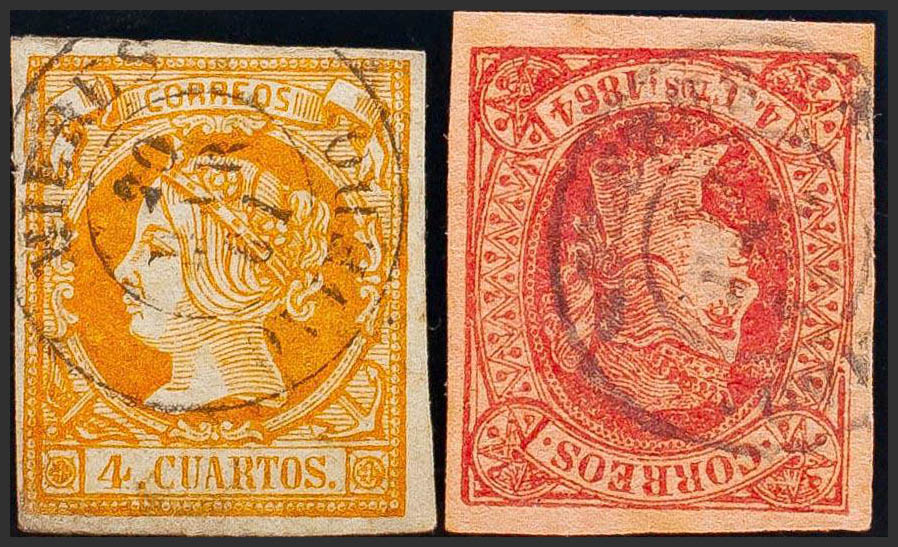 52, 64. (1860ca). Set of two stamps of 4 cuartos yellow and 4 cuartos pink, unused with MIERES / OVIEDO postmark. MAGNIFICENT.
