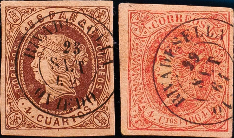 English 58, 64. (1862ca). Set of two stamps of 4 cuartos brown and 4 cuartos pink, unused with RIVADESELLA / OVIEDO postmark. MAGNIFICENT.