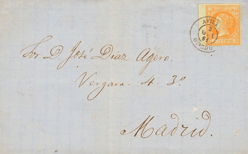 English 52. 1860. 4 cuartos yellow, leaf edge. AVILES to MADRID. Postmark AVILES / OVIEDO. PRETTY.