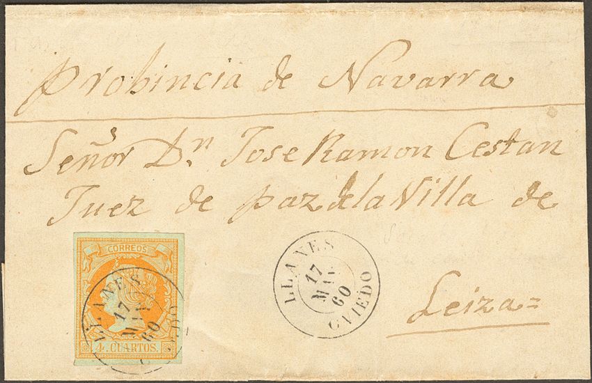 52. 1860. 4 cuartos yellow. LLANES to LEIZA. Postmark LLANES / OVIEDO. MAGNIFICENT.