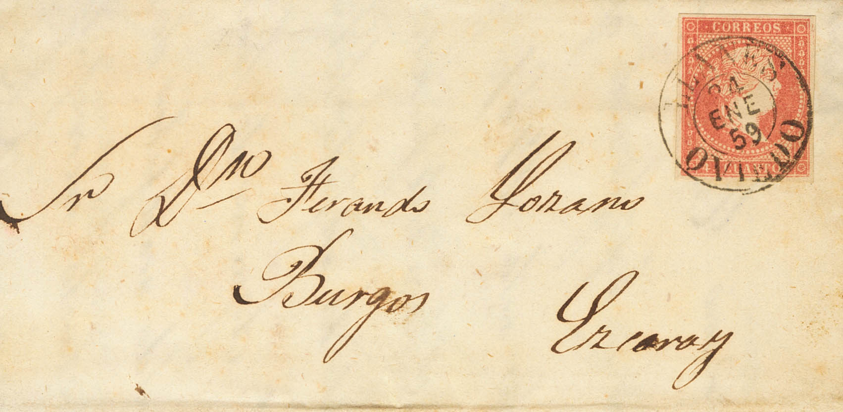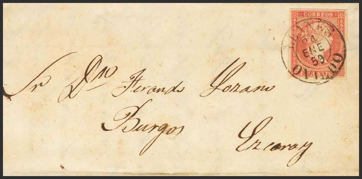 48. 1859. 4 red cuartos . LLANES to EZCARAY. Postmark LLANES / OVIEDO (Type I). MAGNIFICENT.