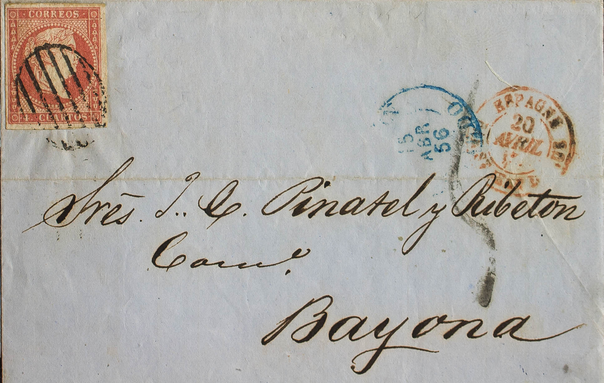 48. 1856. 4 red cuartos . GIJON to BAYONNE (FRANCE). According to the Postal Agreement with France, postage was not compulsory for ordinary mail. MAGNIFICENT AND VERY RARE. Certificate GRAUS.