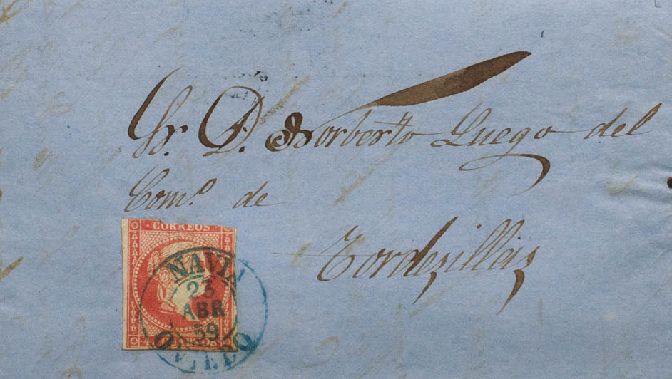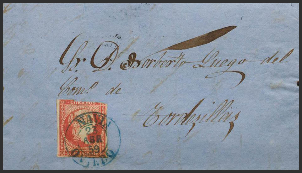 48. 1859. 4 cuartos. ARMAL (ASTURIAS) to TORDESILLAS. Postmark NAVIA / OVIEDO (Type I), in blue. MAGNIFICENT AND VERY RARE, ESPECIALLY IN THIS QUALITY.