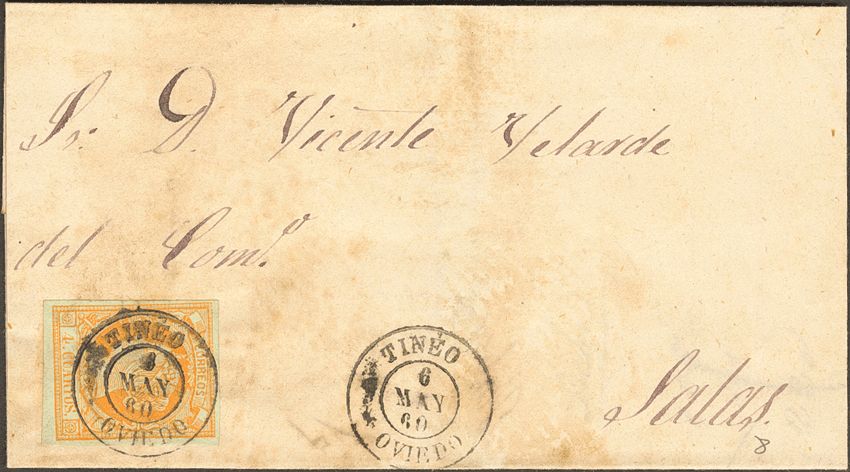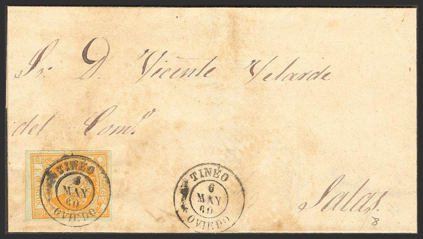 52. 1860. 4 cuartos yellow. TINEO to ROOMS. Postmark TINEO / OVIEDO. PRETTY.