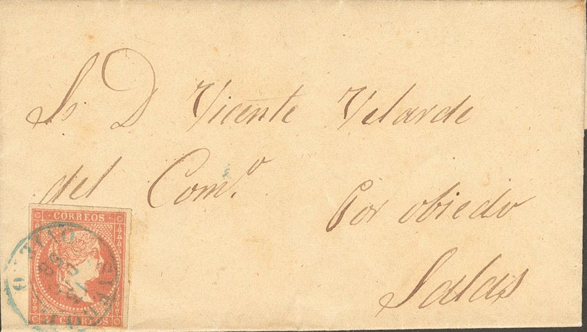 48. 1856. 4 red cuartos . SIERO to ROOMS. Postmark SIERO P. / OVIEDO, in blue (Type I). MAGNIFICENT.
