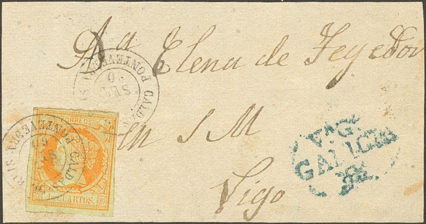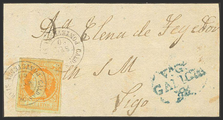 52. 1860. 4 cuartos yellow. Front from CALDAS DE REIS to VIGO. Postmark CALDAS DE REIS / PONTEVEDRA and pre-philatelic mark Vª Gª / GALICIA, in blue. MAGNIFICENT.