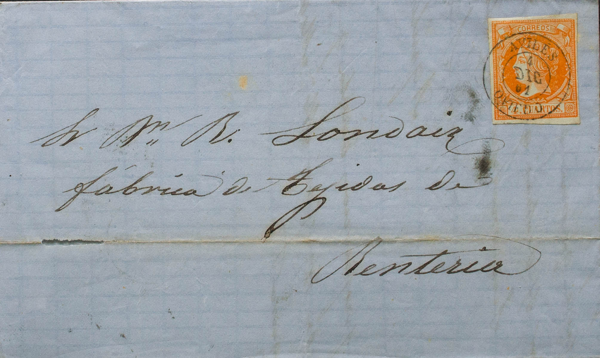 52. 1861. 4 orange cuartos . AVILES to RENTERIA. Postmark AVILES / OVIEDO. MAGNIFICENT.