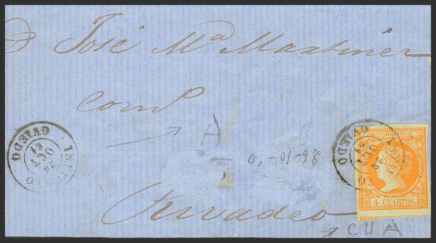 52. 1861. 4 cuartos yellow. Deteriorated front from INFIESTO to RIVADEO. Postmark INFIESTO / OVIEDO.