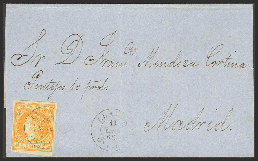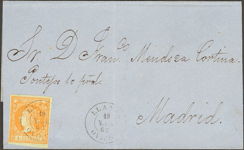 52. 1862. 4 cuartos yellow. LLANES to MADRID. Postmark LLANES / OVIEDO.