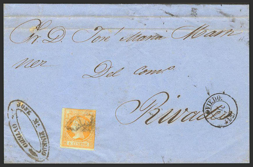 52. 1861. 4 cuartos yellow. OVIEDO to RIVADEO. Postmark R. CARRETA Nº 12. POORLY LEGIBLE.
