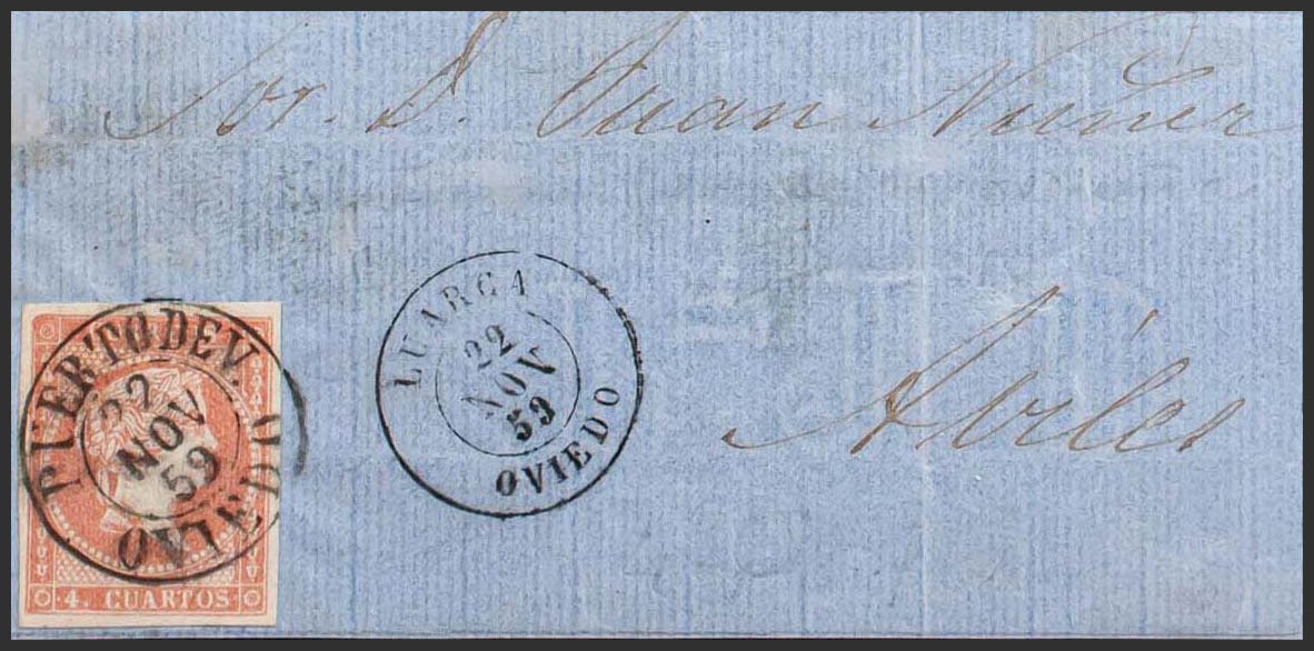 48. 1859. 4 cuartos red. Front of PUERTO DE VEGA (OVIEDO) to AVILES. Postmark PUERTO DE V. / OVIEDO (Type I) and on the front date stamp in transit LUARCA / OVIEDO. MAGNIFICENT AND EXTRAORDINARY RARE.