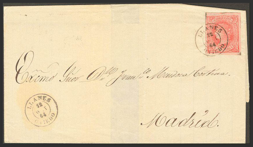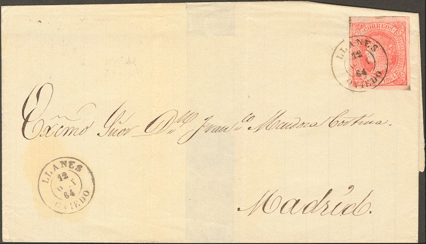 64. 1864. 4 red cuartos . LLANES to MADRID. Postmark LLANES / OVIEDO. MAGNIFICENT.
