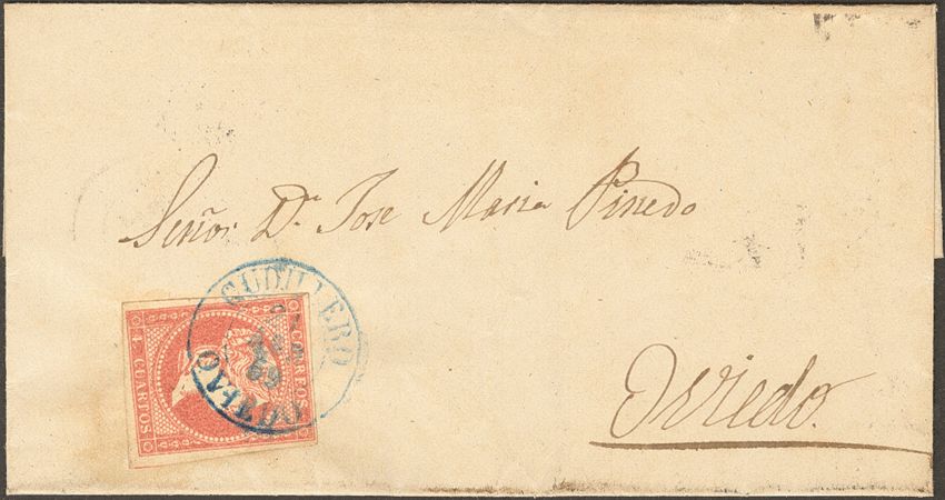 48. 1859. 4 red cuartos . CUDILLERO to OVIEDO. CUDILLERO / OVIEDO postmark (type I), in blue. MAGNIFICENT.