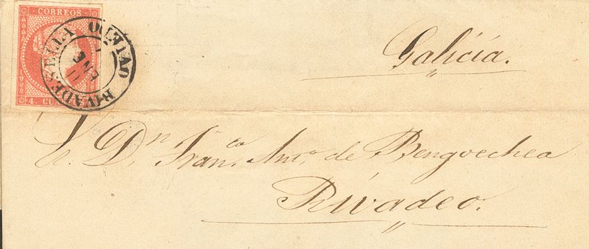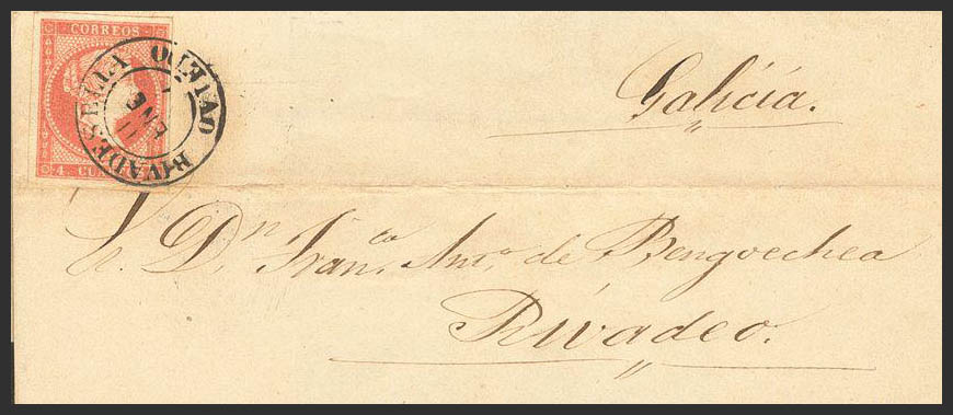 48. 1857. 4 red cuartos . RIVADESELLA to RIVADEO. Postmark RIVADESELLA / OVIEDO (Type I). MAGNIFICENT.
