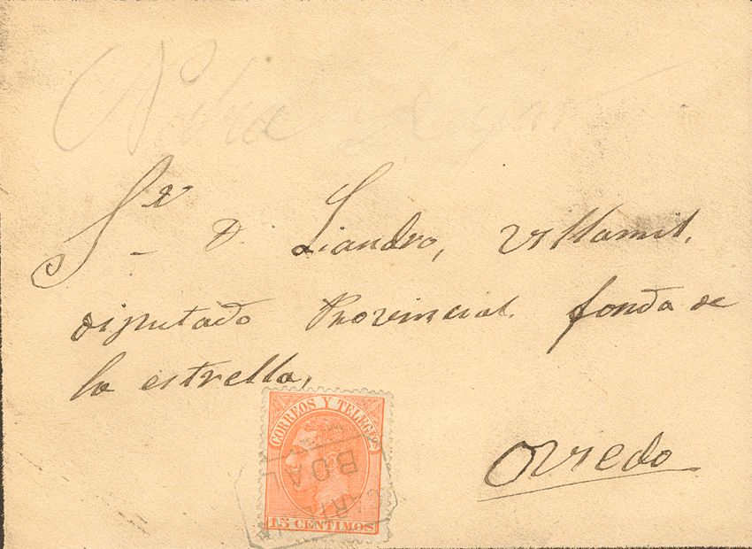 210. 1882. 15 orange cts. BOAL to OVIEDO. Postmark CARTERIA / BOAL. MAGNIFICENT.