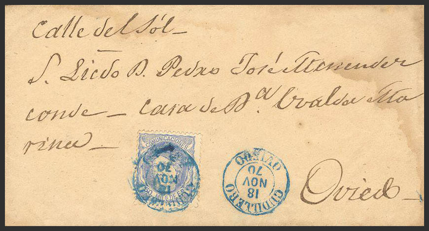 107. 1870. 50 mils blue. CUDILLERO to OVIEDO. Postmark CUDILLERO / OVIEDO (Type I), in blue. MAGNIFICENT AND RARE.