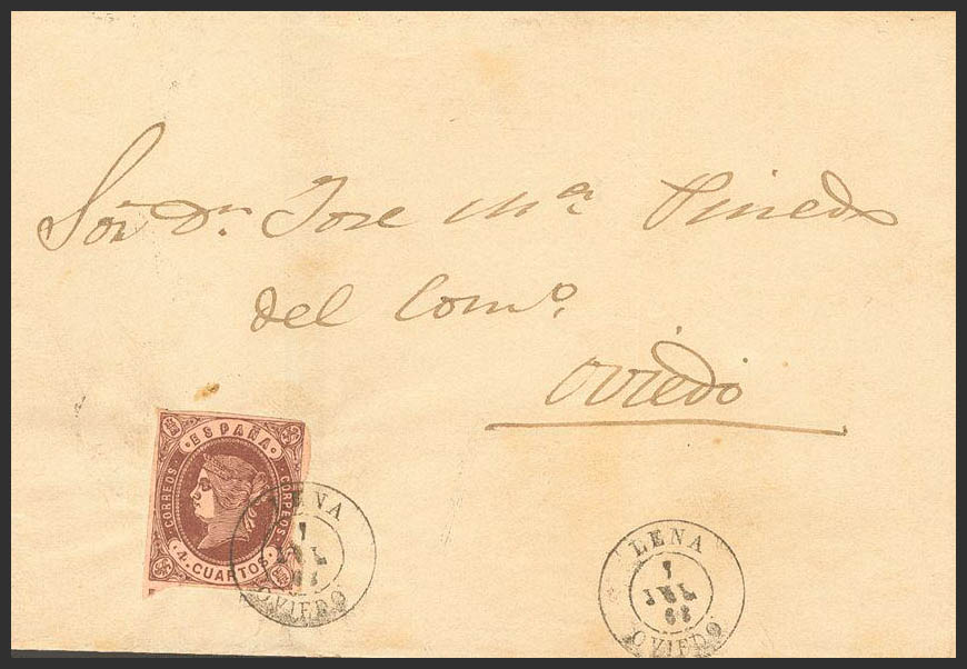 58. 1863. 4- cuartos chestnut. LENA to OVIEDO. Postmark LENA / OVIEDO. MAGNIFICENT AND RARE.