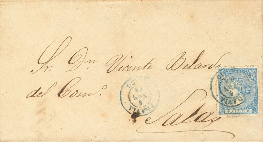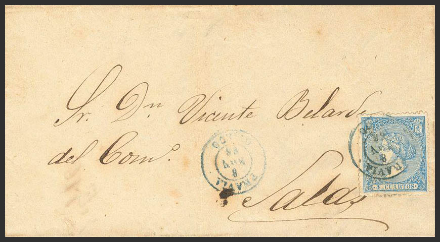 81. 1866. 4 cuartos blue. PRAVIA to ROOMS. Postmark PRAVIA / OVIEDO, in blue. MAGNIFICENT.