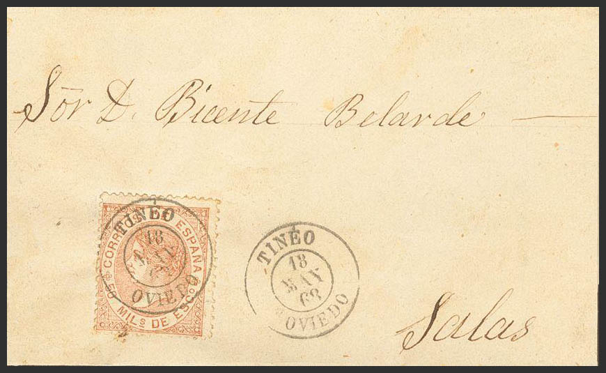 English 96. 1868. 50 mils chestnut. TINEO to ROOMS. Postmark TINEO / OVIEDO. MAGNIFICENT.