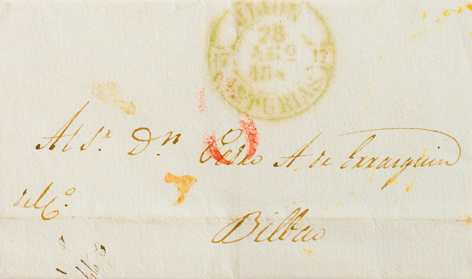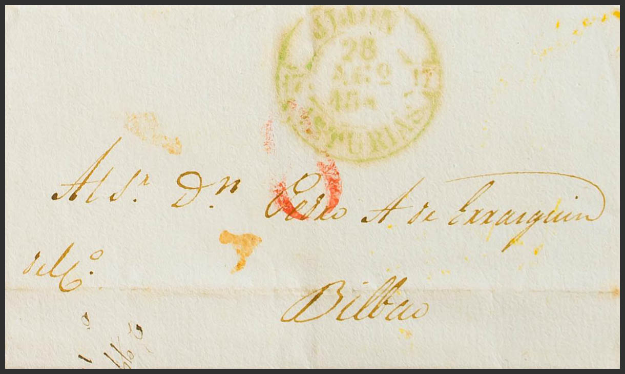 English 1844. GIJON to BILBAO. Baeza JIJON / ASTURIAS, in green. MAGNIFICENT.
