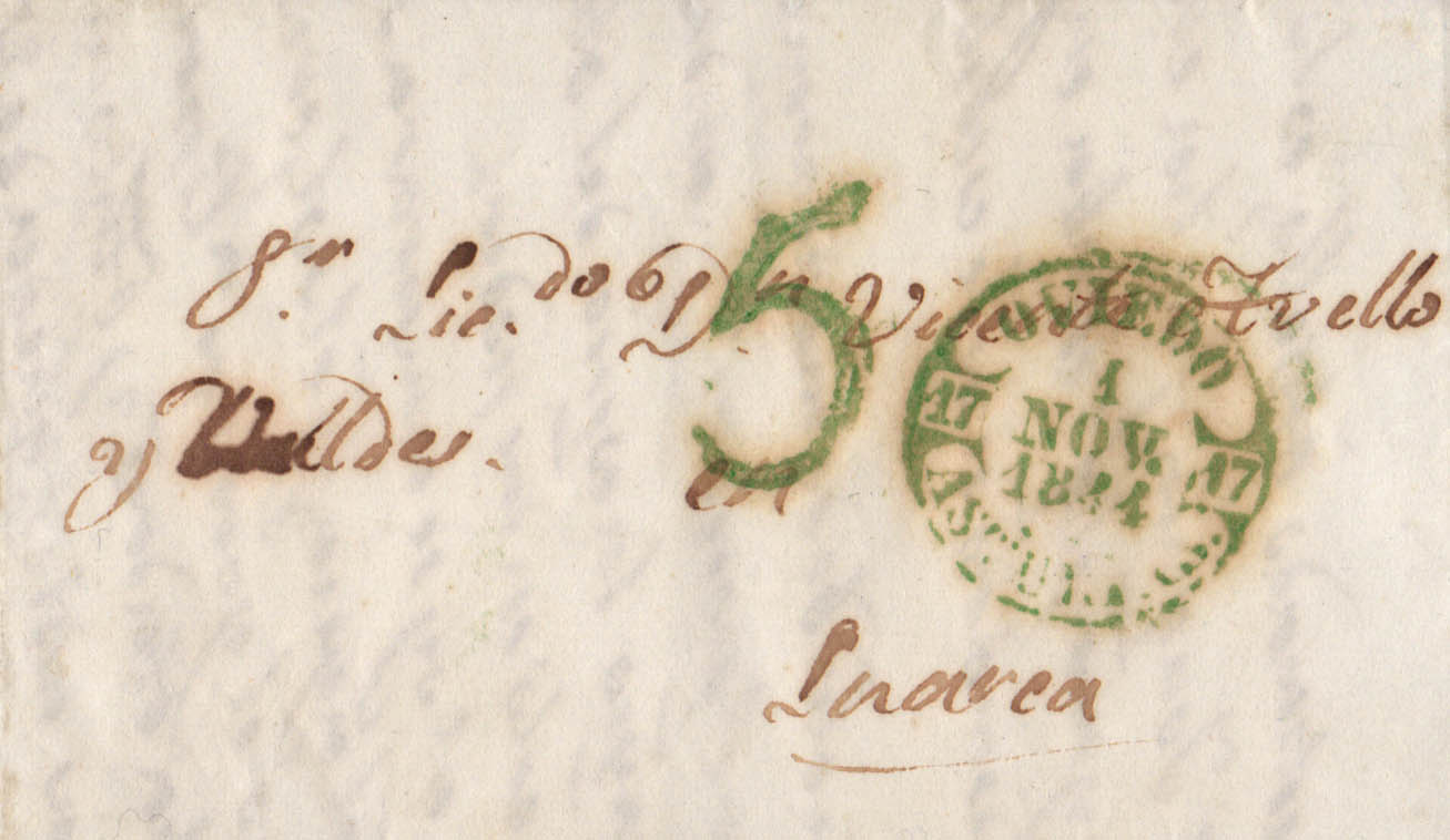 |ABOUT|1844. OVIEDO to LUAGoodA. Baeza OVIEDO / LUAGoodA, in green. MAGNIFICENT.