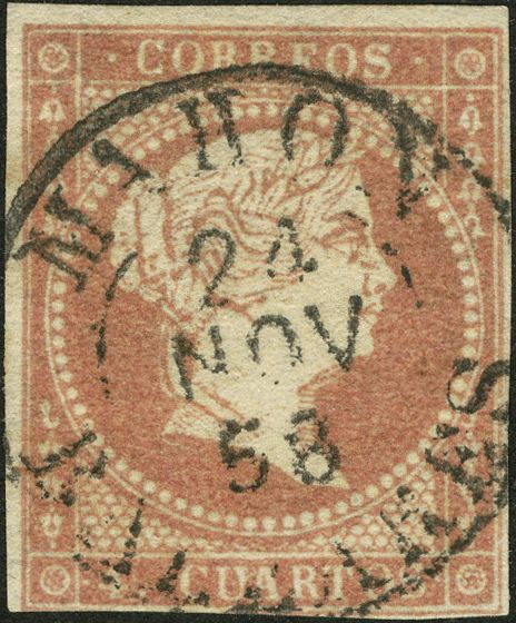 English 48. 1856. 4 red cuartos . Postmark MAHON / BALEARES (Type I). MAGNIFICENT.