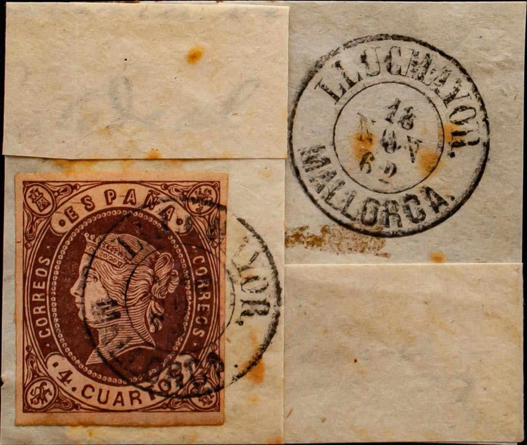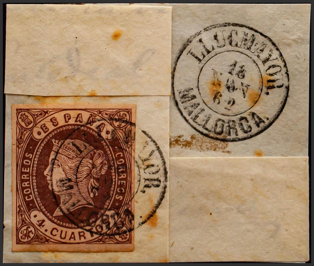 English △ 58. 1862. 4 chestnut cuartos , on fragment. Postmark LLUCHMAYOR / BALEARIC ISLANDS. MAGNIFICENT.