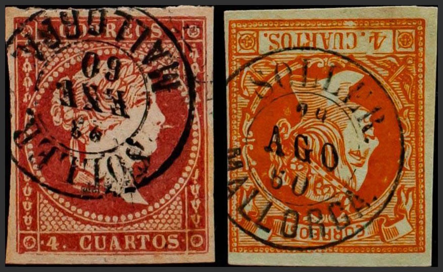 48, 52. 1855. Set of two stamps of 4 cuartos red and 4 cuartos yellow, unused with SOLLER / BALEARES postmark. MAGNIFICENT.