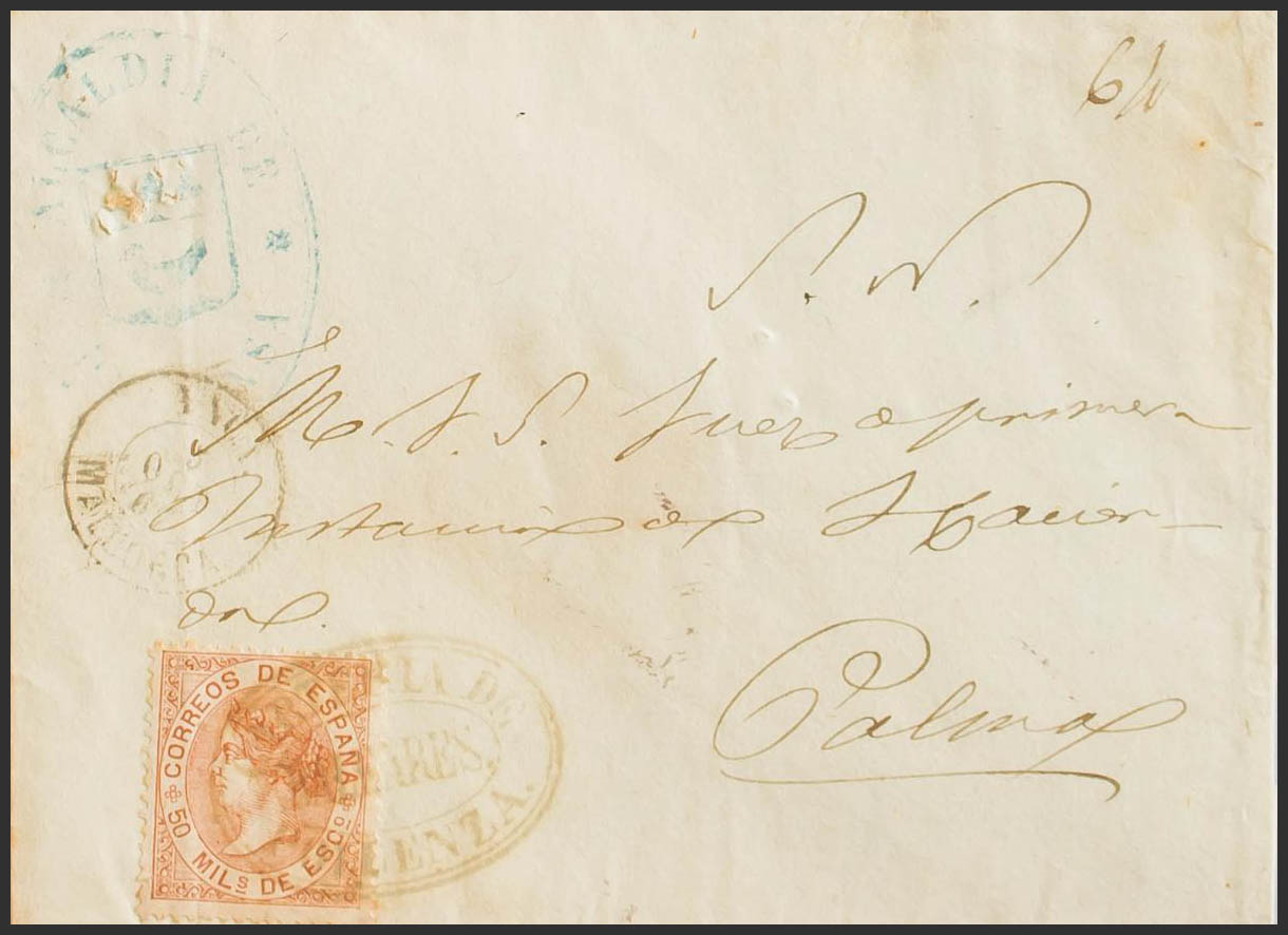 96. 1867. 50 mils chestnut. POLLENSA to PALMA. Special postmark CARTERIA DE / BALEARES / POLLENSA. MAGNIFICENT AND EXTRAORDINARILY RARE AND MORE IN THIS PRINTING.