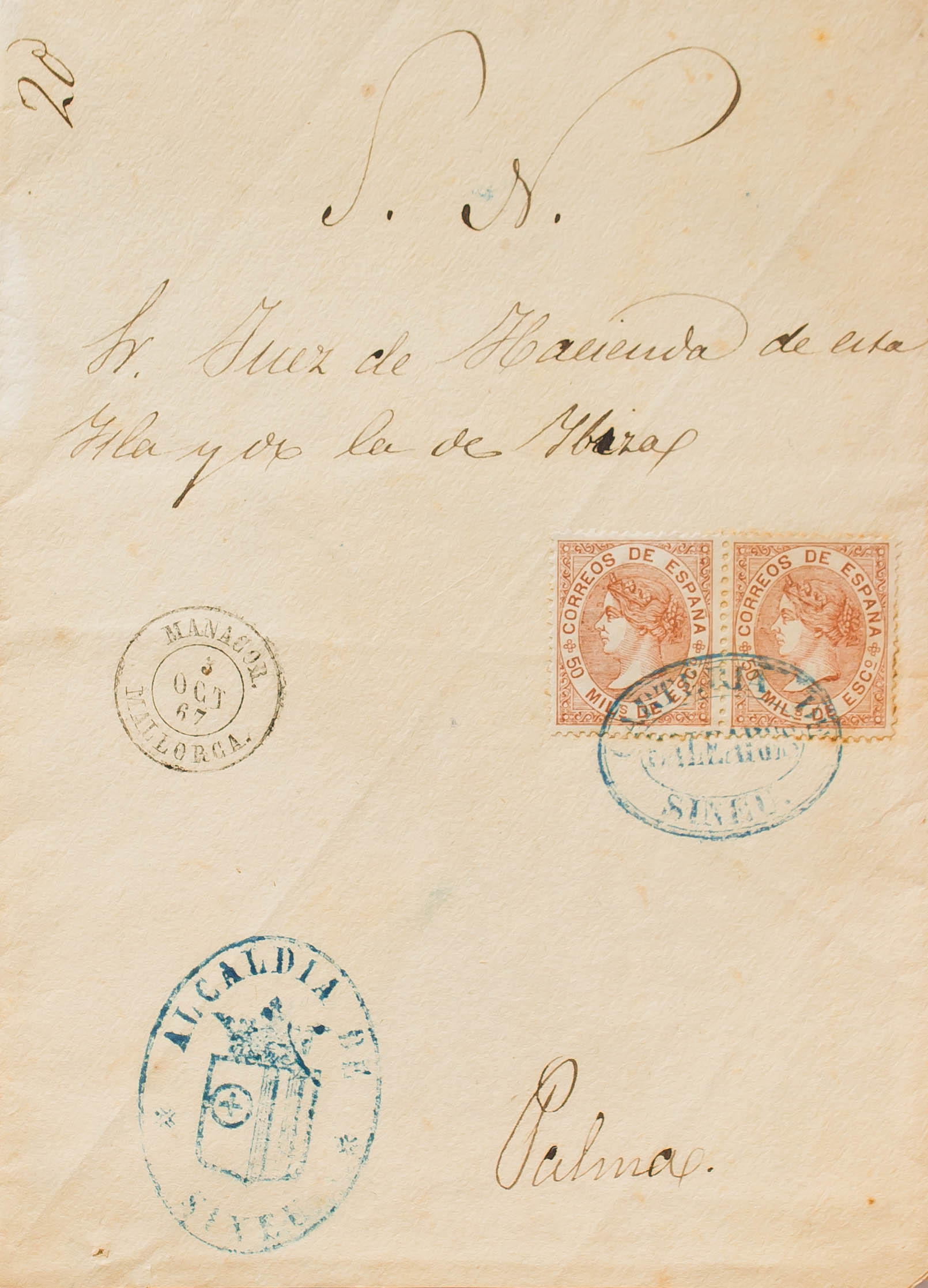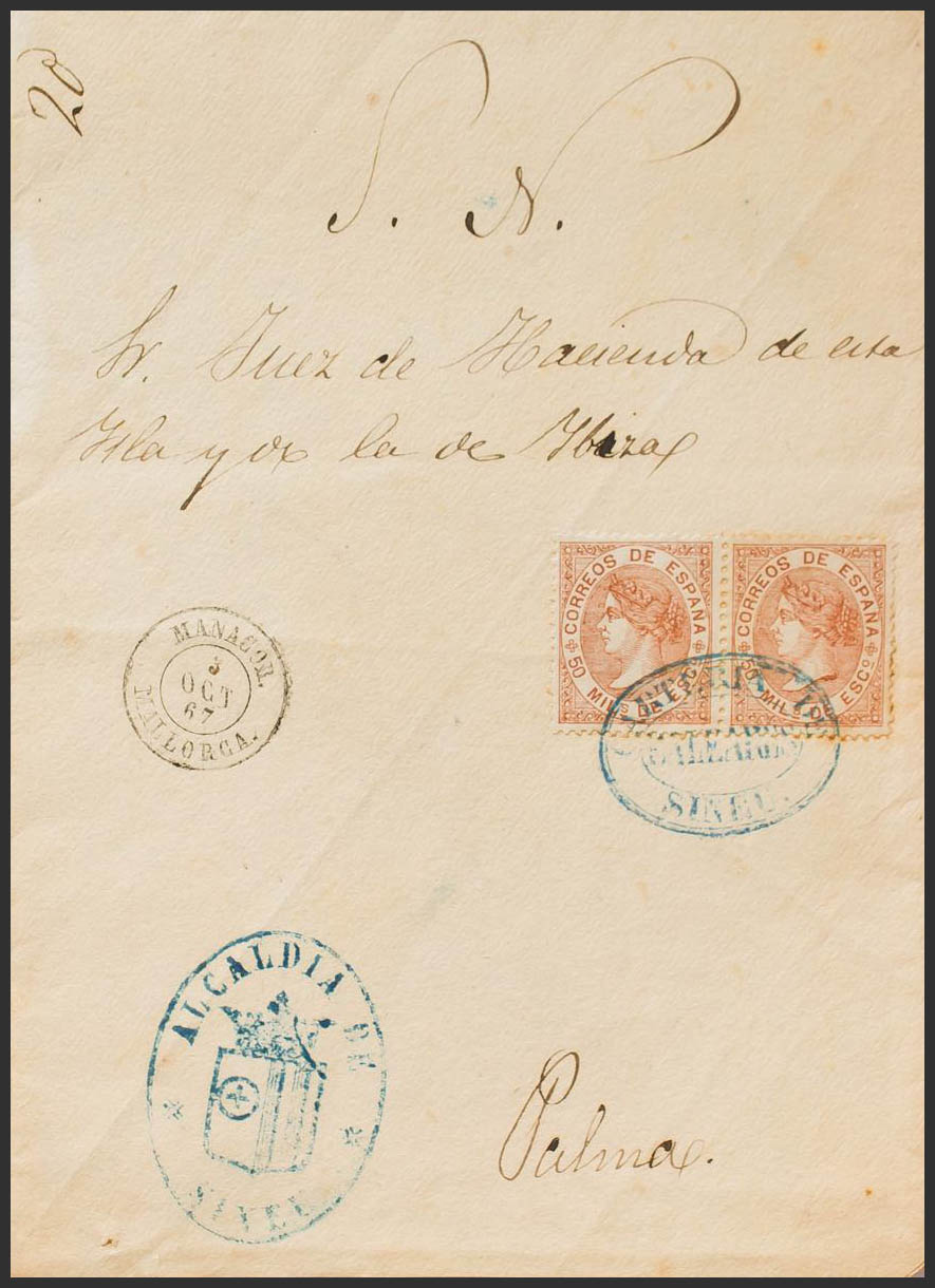 96(2). 1867. 50 mils chestnut, pair. SINEU to PALMA. Special postmark CARTERIA DE / BALEARES / SINEU, in blue and mark ALCALDIA DE / SINEU. MAGNIFICENT AND EXTRAORDINARILY RARE, ESPECIALLY IN THIS EXCEPTIONAL QUALITY.