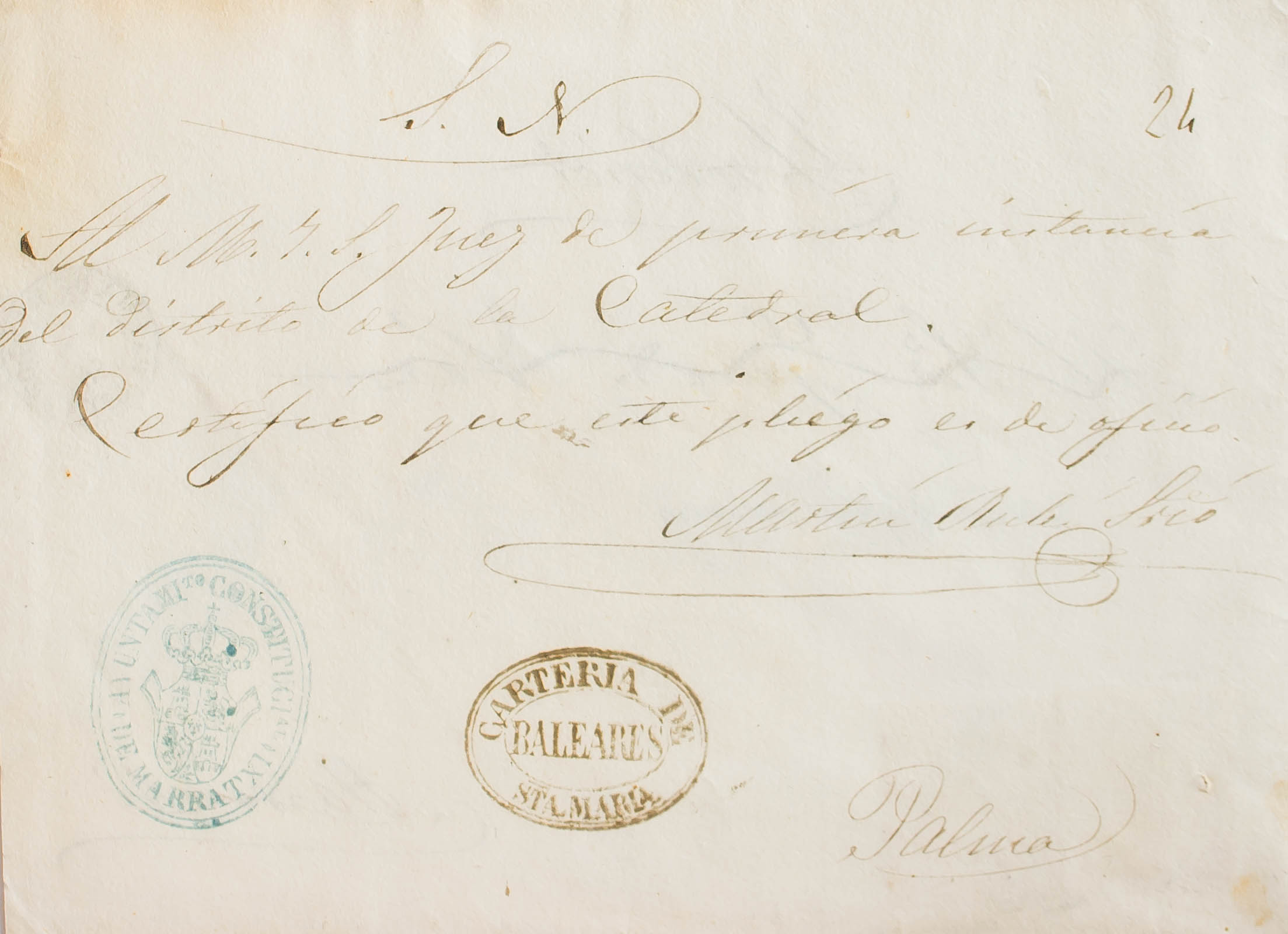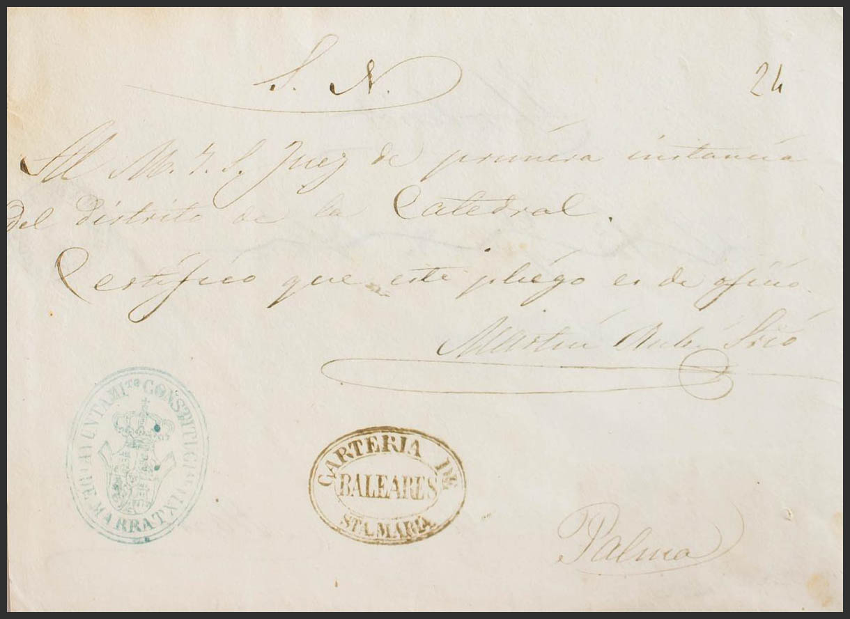 1868. Letter reused (the previous transit was franked with two 4- cuartos stamps from PALMA to MARRATXI) and later from MARRATXI to PALMA. On the front and acting as a franchise mark CONSTITUTIONAL TOWN HALL / DE MARRATXI and in transit special mark CARTERIA DE / BALEARES / STA. MARTHA. MAGNIFICENT AND VERY RARE ESPECIALLY WITH THIS EXCEPTIONAL PRINTING.