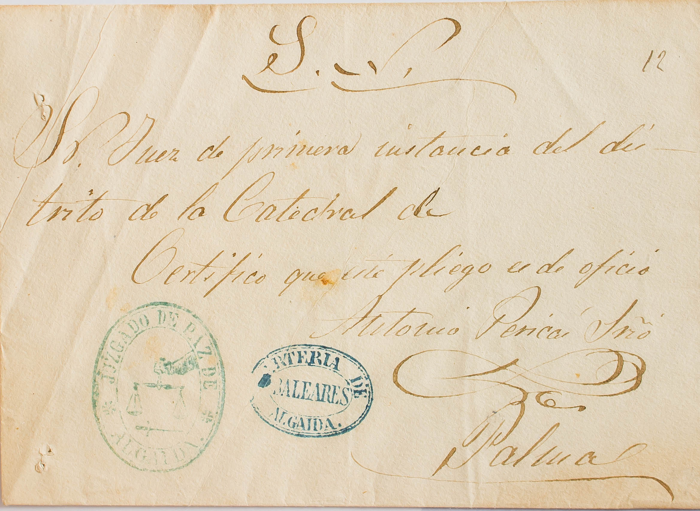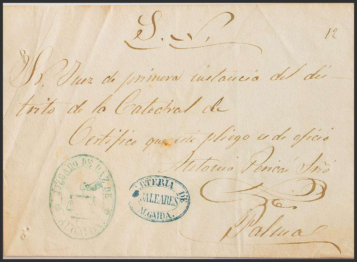 (1867ca). ALGAIDA to PALMA. Mark JUZGADO DE PAZ / ALGAIDA, acting as franchise and special mark in transit CARTERIA DE / BALEARES / ALGAIDA, in blue. MAGNIFICENT AND VERY RARE ESPECIALLY WITH THIS EXCEPTIONAL PRINTING.