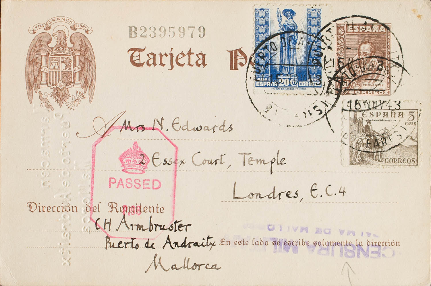 EP83, 916, 961. 1943. 20 cts brown on Entire Post Card from PUERTO DE ANDRAITX to LONDON (ENGLAND), with additional postage of 5 cts sepia and 20 cts blue. On the front English censor mark. MAGNIFICENT AND SPECTACULAR.