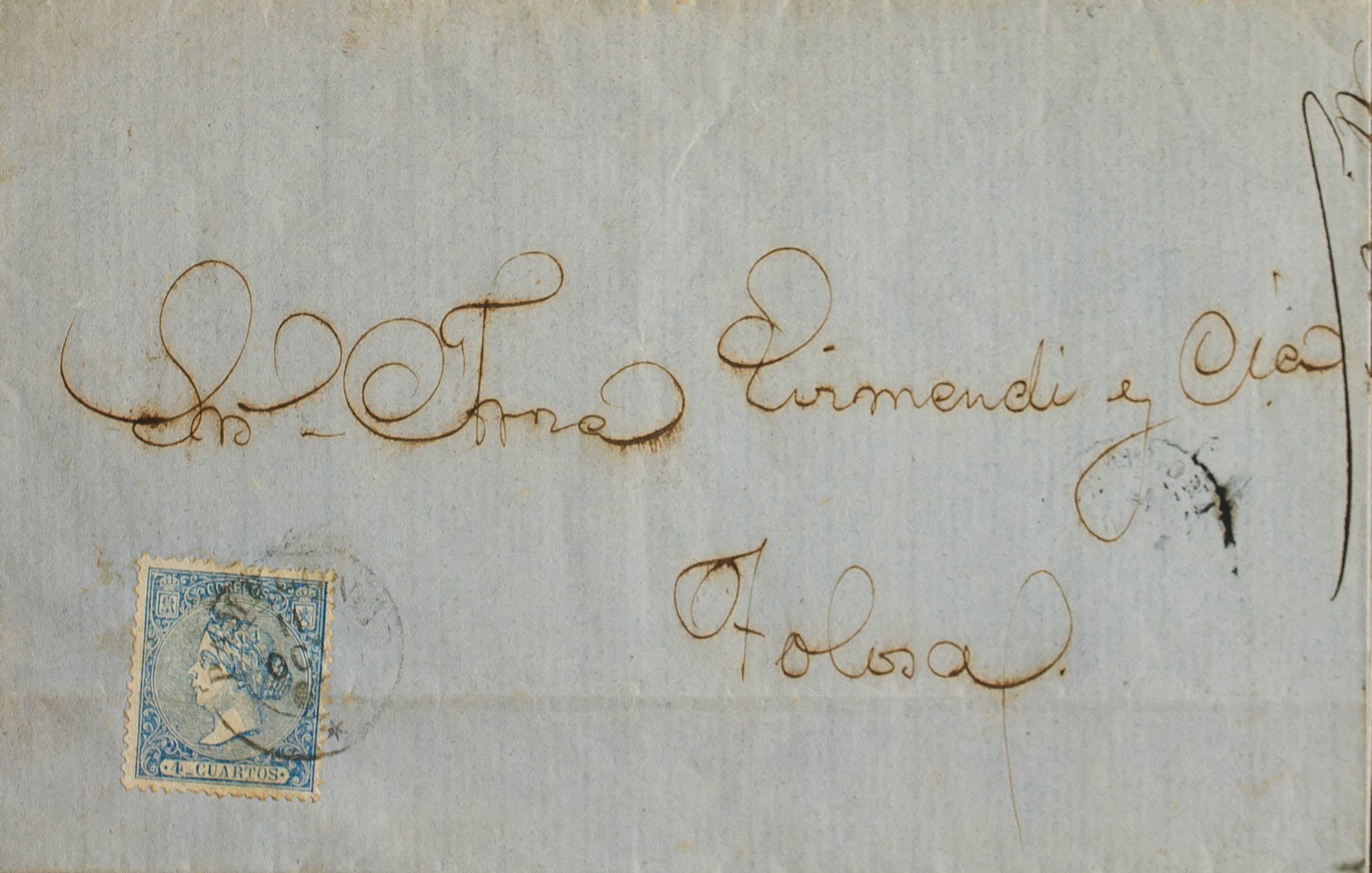 81. 1866. 4 cuartos blue. PAMPLONA to TOLOSA. Postmark * / PAMPLONA (Type I). MAGNIFICENT AND RARE.