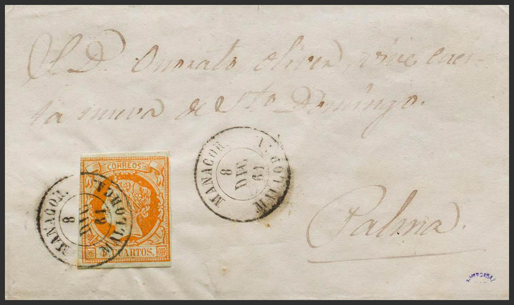 52. 1861. 4 red cuartos . MANACOR to PALMA DE MALLORCA. Postmark MANACOR / MALLORCA. MAGNIFICENT AND RARE.