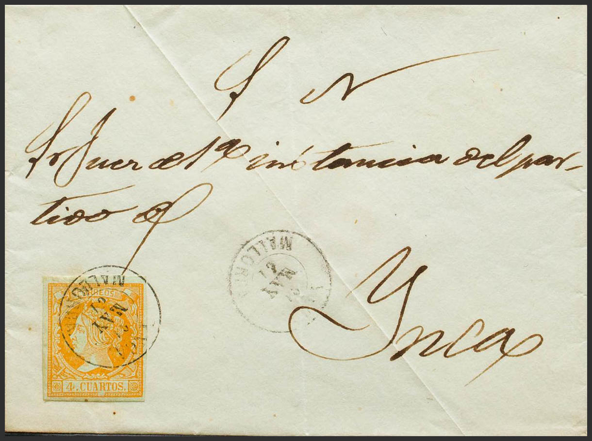 52. 1861. 4 orange cuartos . Addressed to INCA. Postmark YNCA / MALLORCA, upon arrival. MAGNIFICENT AND RARE.