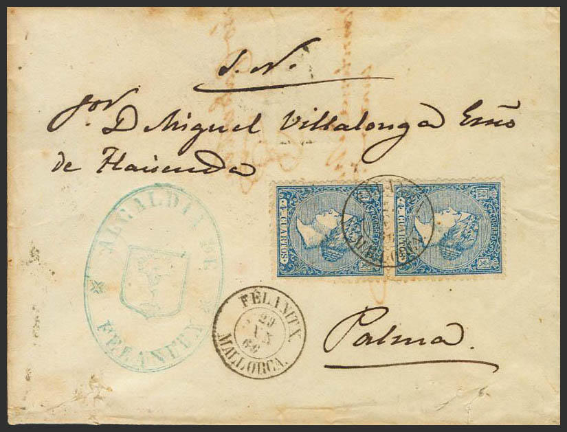 81(2). 1866. 4 cuartos blue, pair. FELANITX (MALLORCA) to PALMA DE MALLORCA. Postmark FELANITX / MALLORCA. MAGNIFICENT AND VERY RARE.