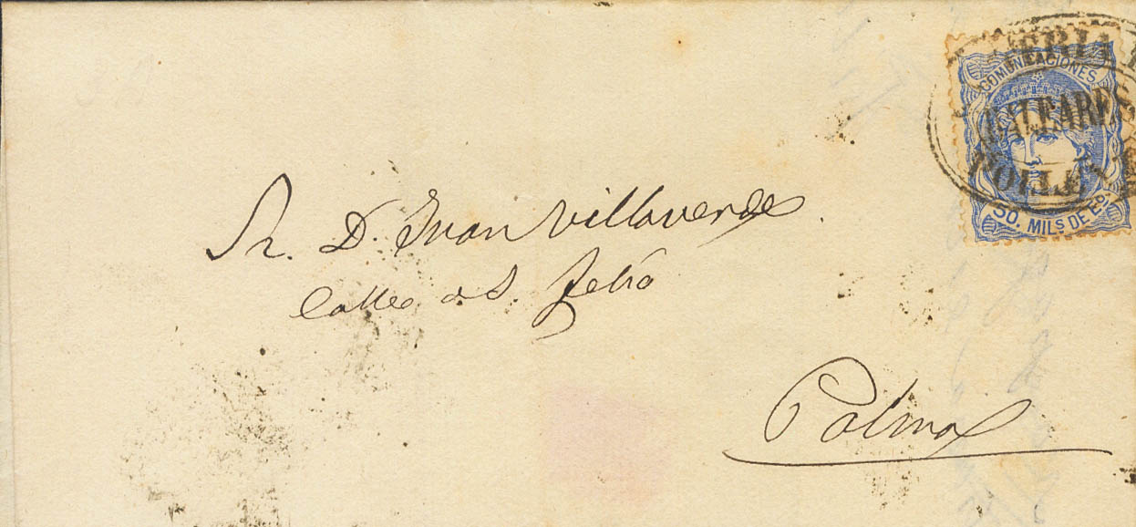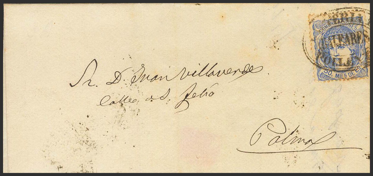 107. 1871. 50 mils overseas. POLLENSA (BALEARIC ISLANDS) to PALMA DE MALLORCA. Postmark CARTERIA DE / POLLENZA. MAGNIFICENT AND RARE.